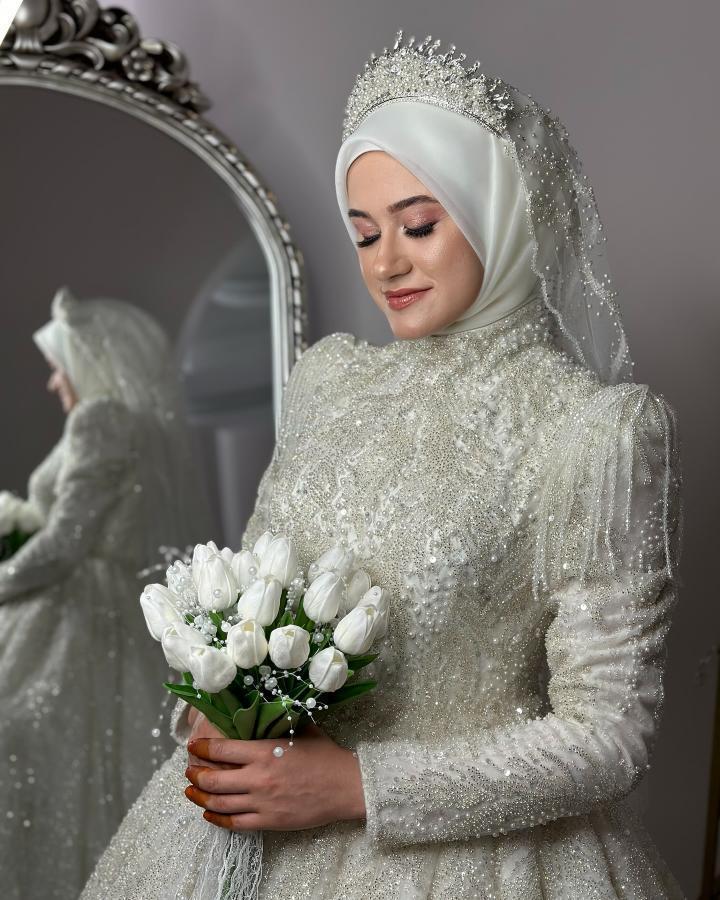 Afyonkarahisar’da tesettürlü gelin adayları için 2026 koleksiyonunda modern ve sade tasarımlar öne çıkmaktadır. Uzun kollu ve yüksek yaka modellerde minimal taş detayları tercih edilmektedir.